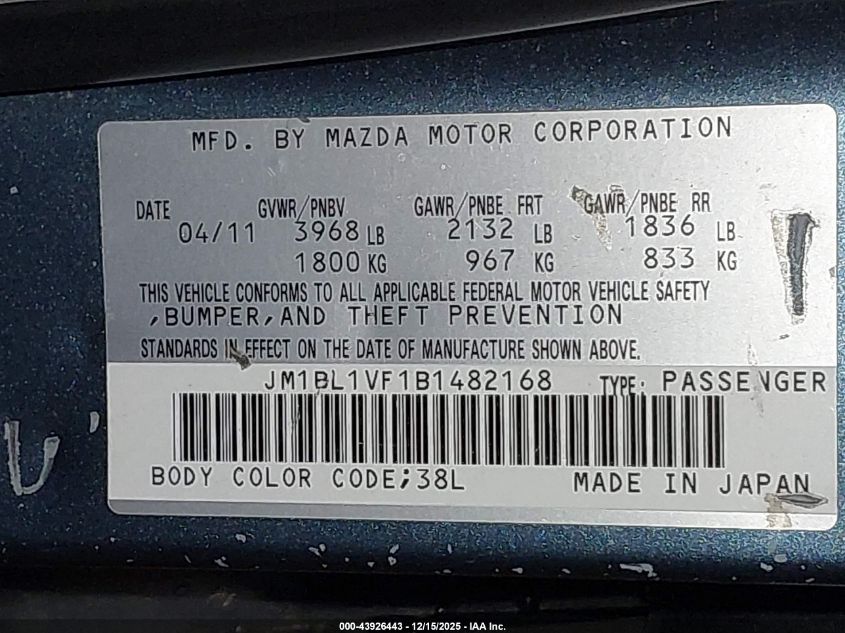 Колір СинійЦиліндри 4Привід Передній привідVIN JM1BL1VF1B1482168Стан Заводиться та їде (перевірено)Ушкодження Задня