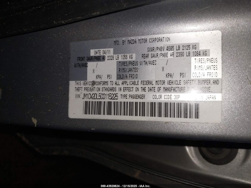 Колір СрібнийЦиліндри 4Привід Передній привідVIN JM1CW2DL5C0115225Стан СтаціонарноУшкодження Перекидання