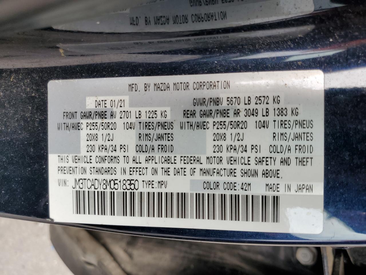 2021 MAZDA CX-9 - JM3TCADY8M0518350, колір - Синій, 2.5, Бензин, із США