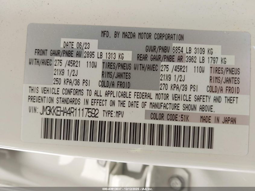 2024 MAZDA CX-90 - JM3KKEHA4R1117592, колір - Білий, 2.5, Гібрид, Повний привід із США