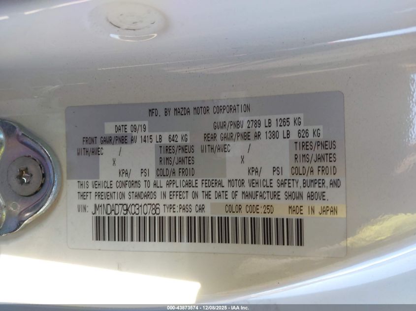 2019 MAZDA MX-5 - JM1NDAD79K0310786, колір - Білий, 2.0, Бензин, Задній привід із США