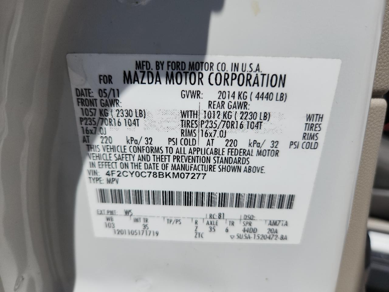 2011 MAZDA TRIBUTE - 4F2CY0C78BKM07277, колір - Білий, 2.5, Бензин, із США