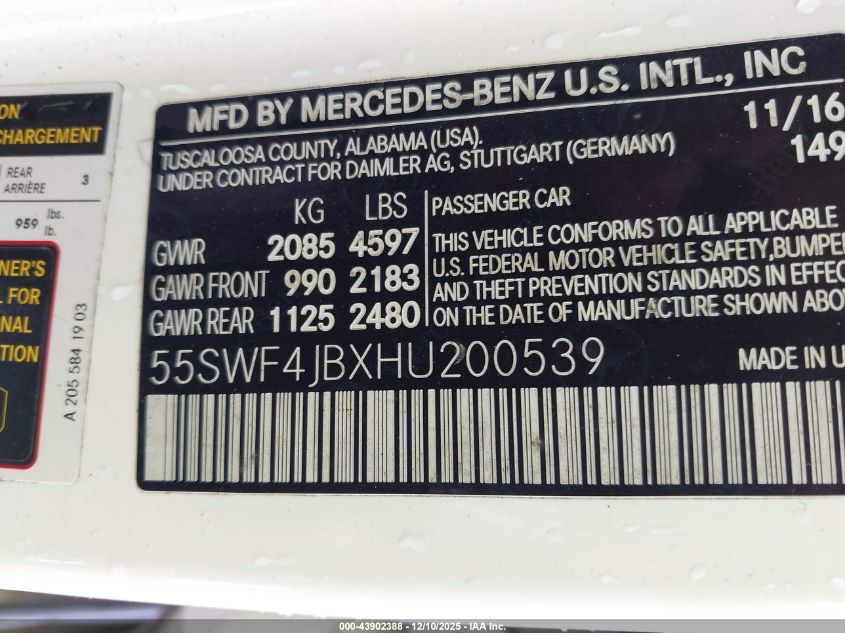 2017 MERCEDES-BENZ C-CLASS - 55SWF4JBXHU200539, колір - Білий, 2.0, Бензин, Задній привід із США