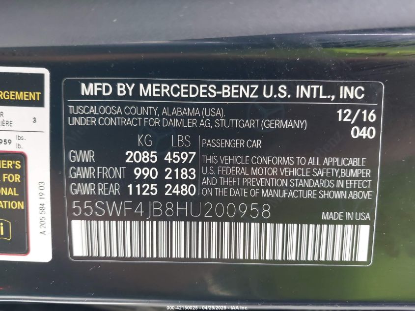 2017 MERCEDES-BENZ C-CLASS - 55SWF4JB8HU200958, колір - Чорний, 2.0, Бензин, Задній привід із США