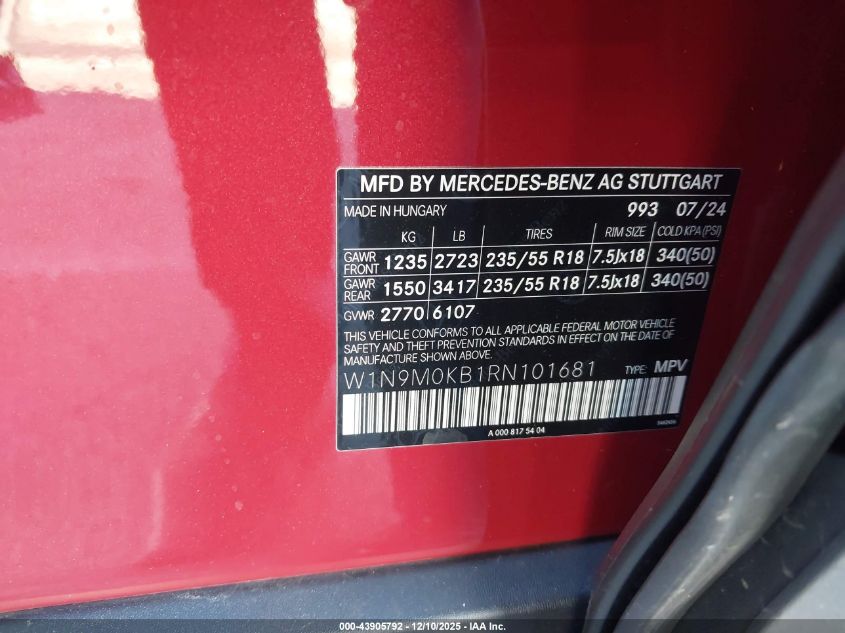 2024 MERCEDES-BENZ EQB - W1N9M0KB1RN101681, колір - Червоний, U, Електричний, Повний привід із США