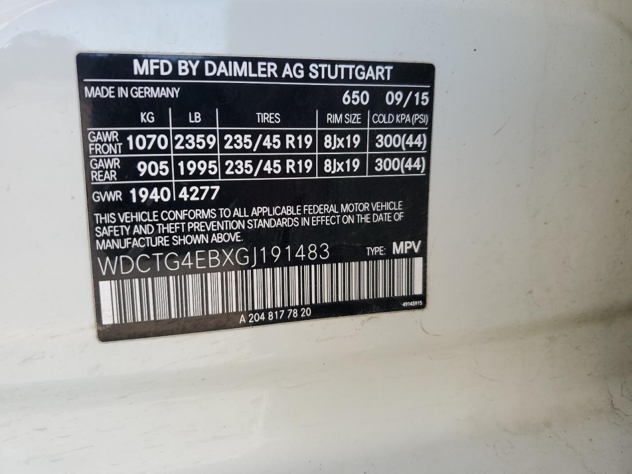 Колір БілийЦиліндри 4VIN WDCTG4EBXGJ191483Стан Заводиться та їде (перевірено)Ушкодження НезначніДата аукціона 2025-10-09