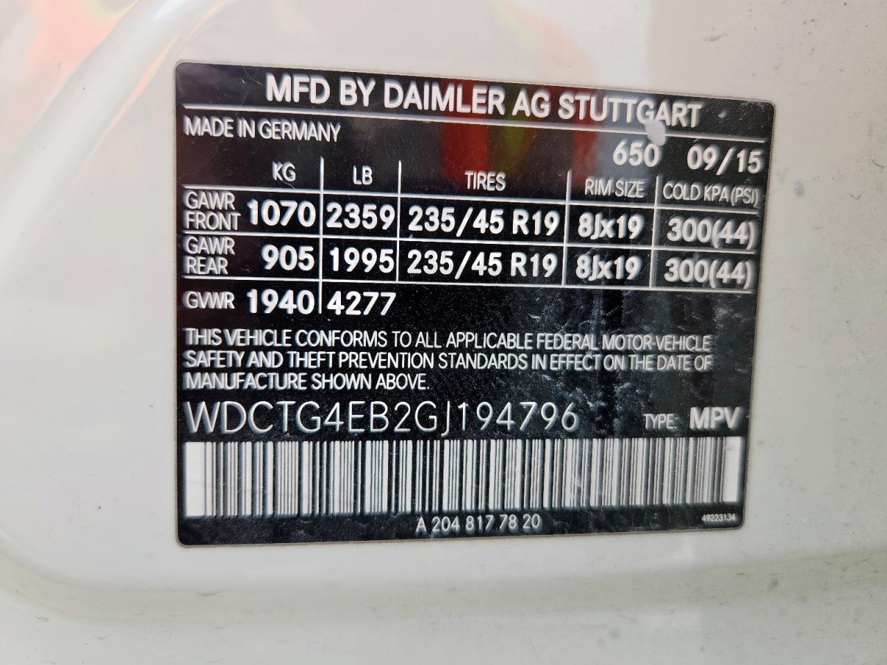 Колір БілийЦиліндри 4VIN WDCTG4EB2GJ194796Стан НевідомоУшкодження НезначніДата аукціона 2025-10-09