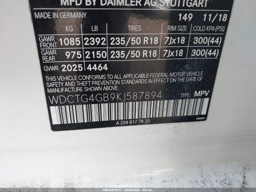 Колір БілийЦиліндри 4Привід Повний привідVIN WDCTG4GB9KJ587894Стан СтаціонарноУшкодження Передня і задня
