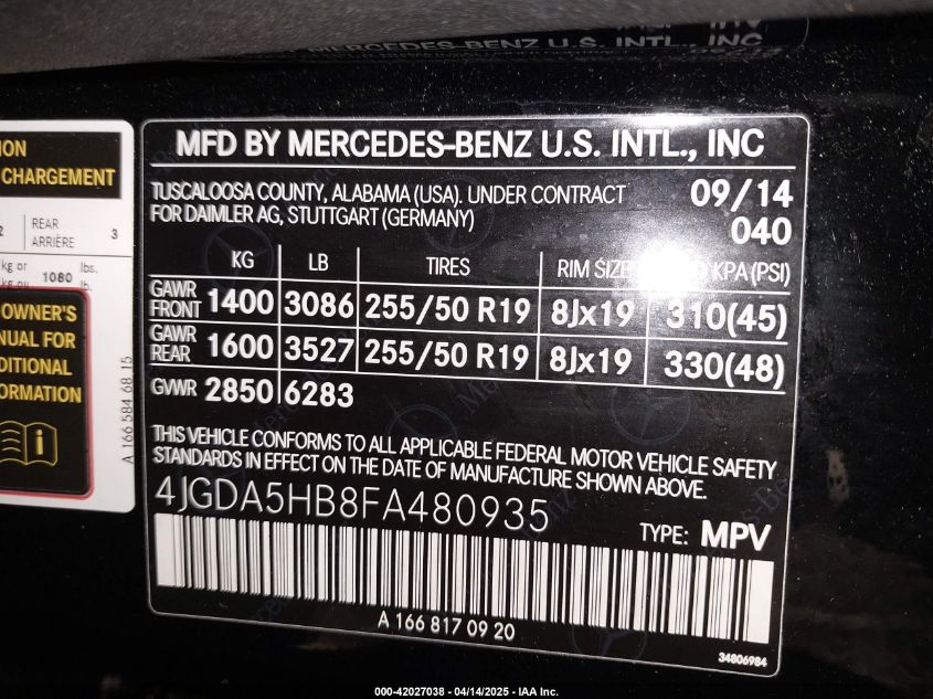 2015 MERCEDES-BENZ M-CLASS - 4JGDA5HB8FA480935, колір - Чорний, 3.5, Бензин, Повний привід із США