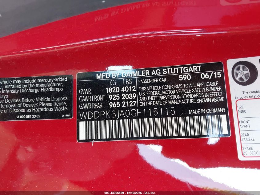 Колір ЧервонийЦиліндри 4Привід Задній привідVIN WDDPK3JA0GF115115Стан СтаціонарноУшкодження Передня або задня