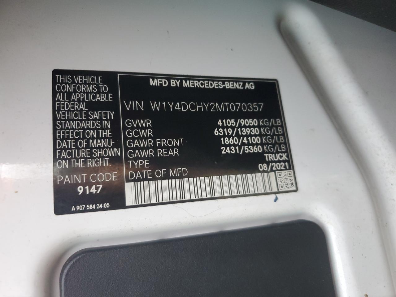 2021 MERCEDES-BENZ SPRINTER - W1Y4DCHY2MT070357, колір - Білий, 2.2, Дизель, Задній привід із США