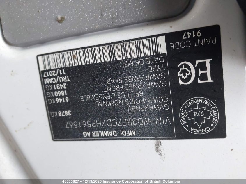 Колір БілийЦиліндри 6Привід Задній привідVIN WD3BE7CD7HP561567Стан СтаціонарноУшкодження ПередняДата аукціона 2025-12-17