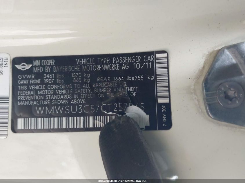 2012 MINI COOPER - WMWSU3C57CT257565, колір - Кремовий, 1.6, Бензин, Передній привід із США