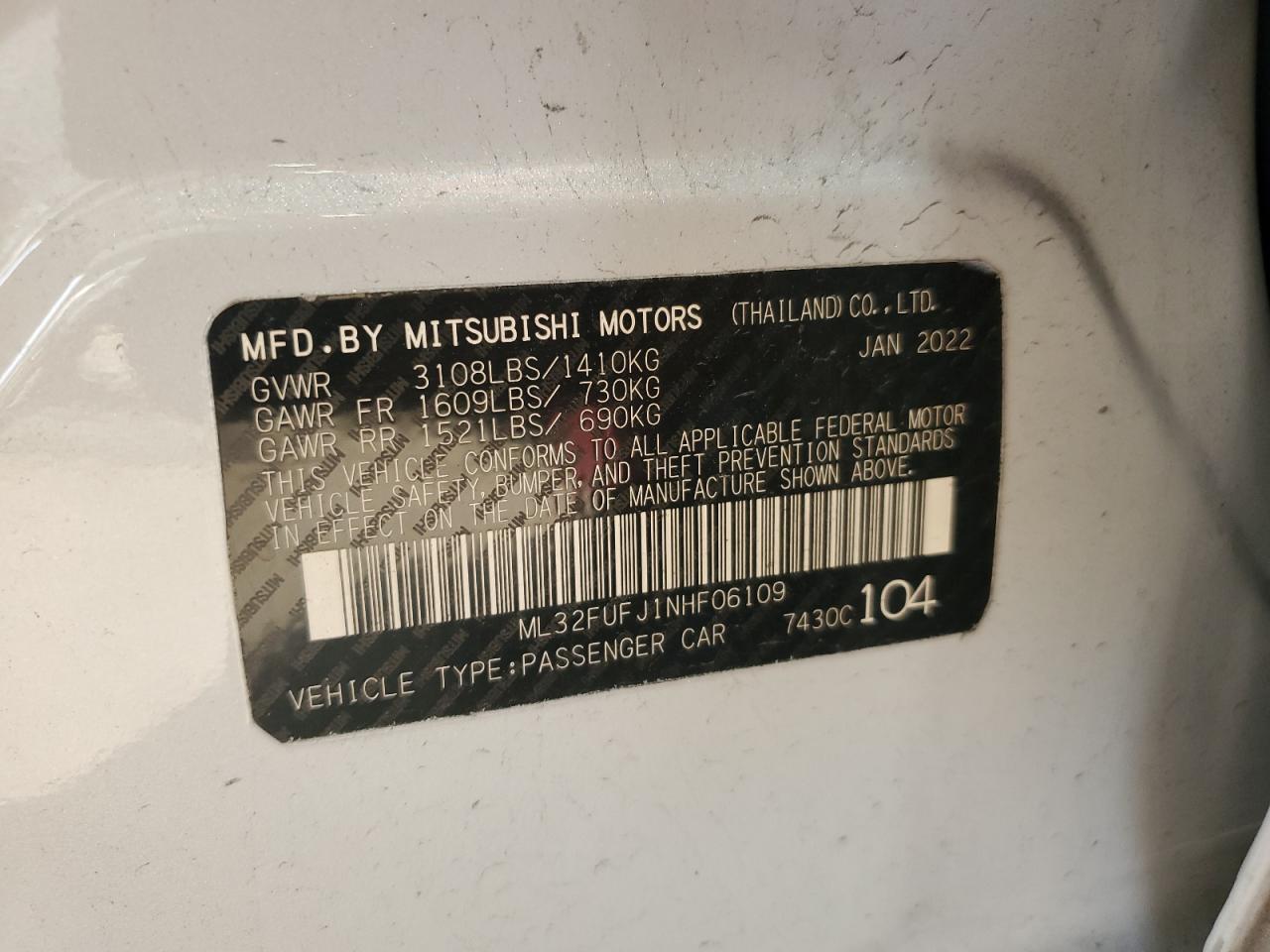 2022 MITSUBISHI MIRAGE - ML32FUFJ1NHF06109, колір - Білий, 1.2, Бензин, із США