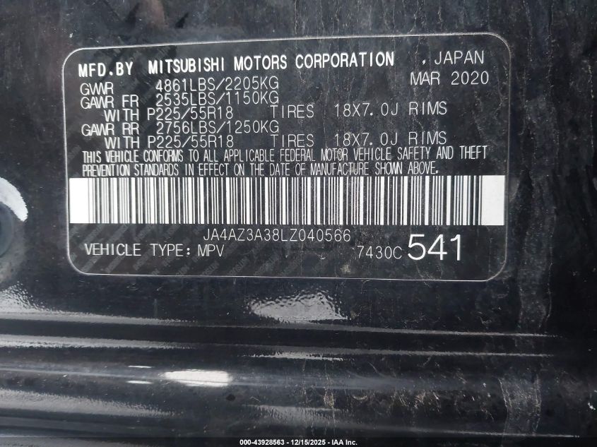 2020 MITSUBISHI OUTLANDER - JA4AZ3A38LZ040566, колір - Чорний, 2.4, Бензин, Повний привід із США