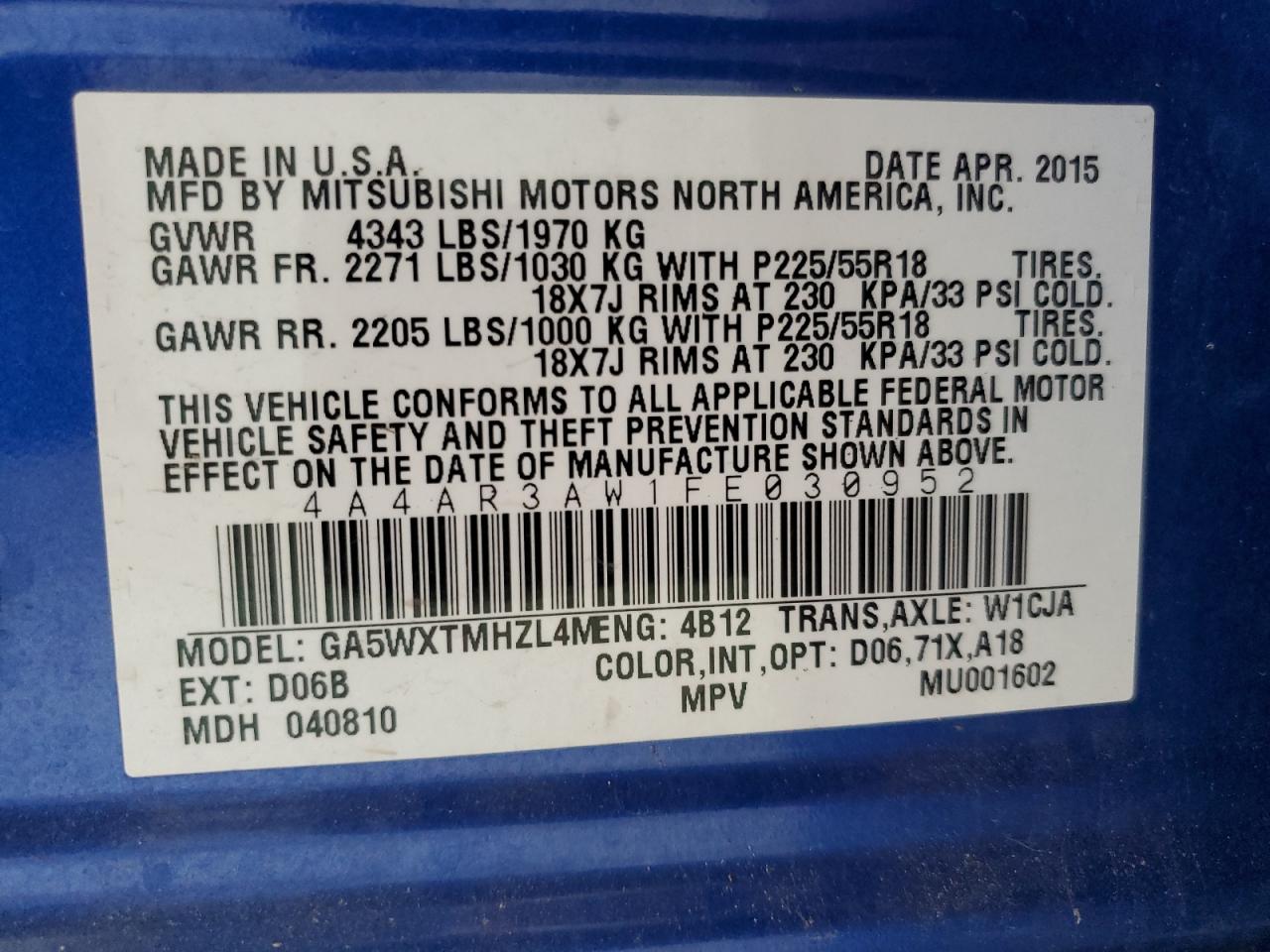 2015 MITSUBISHI OUTLANDER - 4A4AR3AW1FE030952, колір - Синій, 2.4, Бензин, Повний привід із США