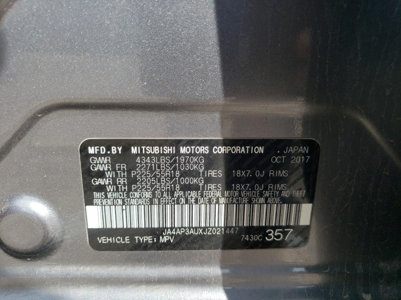 2018 MITSUBISHI OUTLANDER - JA4AP3AUXJZ021447, колір - Сірий, 2.0, Бензин, із США