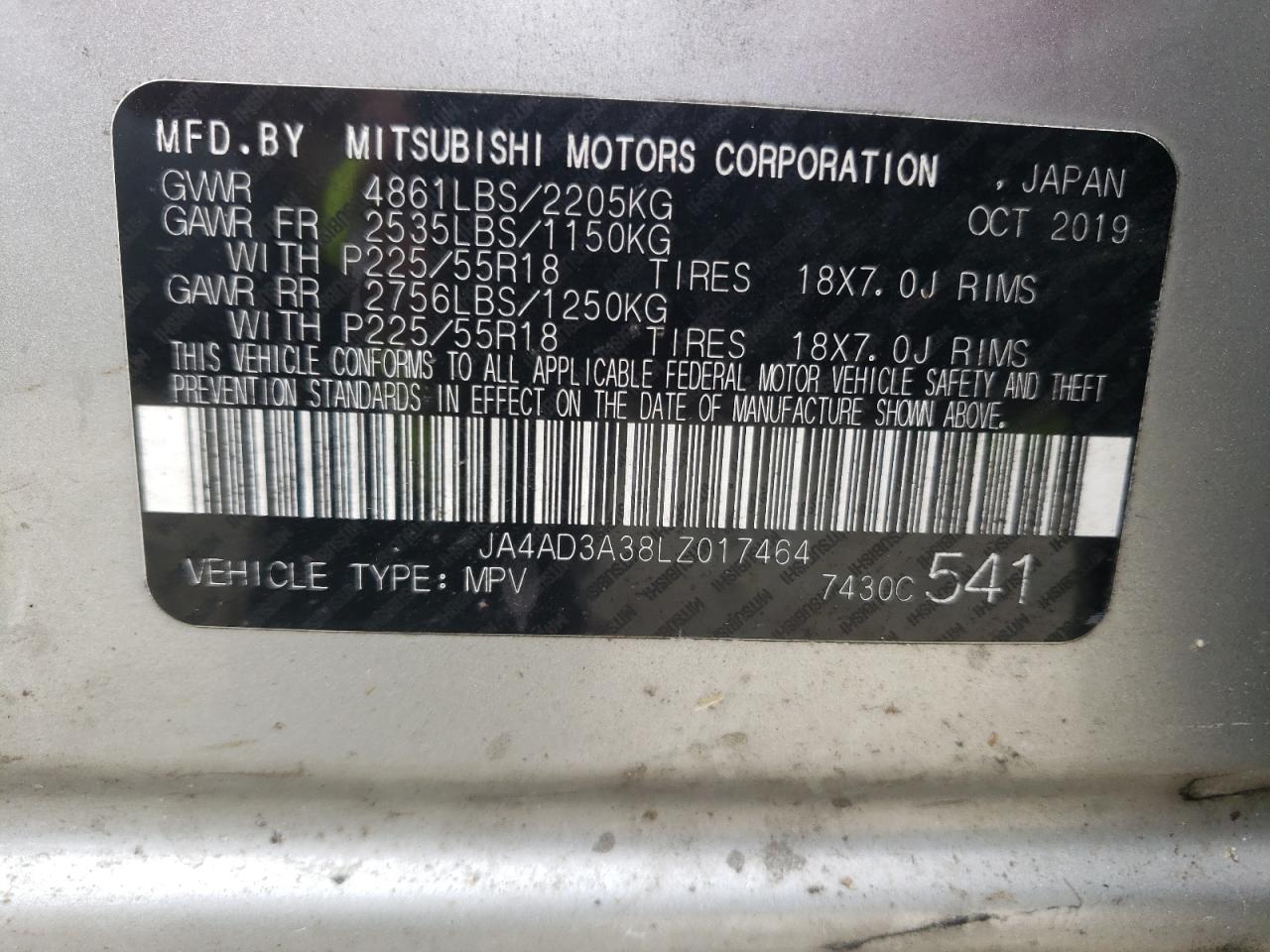2020 MITSUBISHI OUTLANDER - JA4AD3A38LZ017464, колір - Срібний, 2.4, Бензин, із США