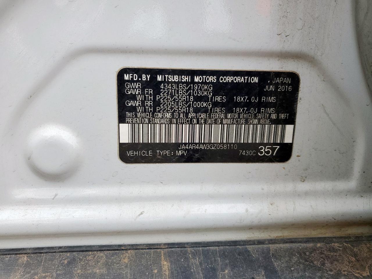 2016 MITSUBISHI OUTLANDER - JA4AR4AW3GZ058110, колір - Білий, 2.4, Бензин, Повний привід із США