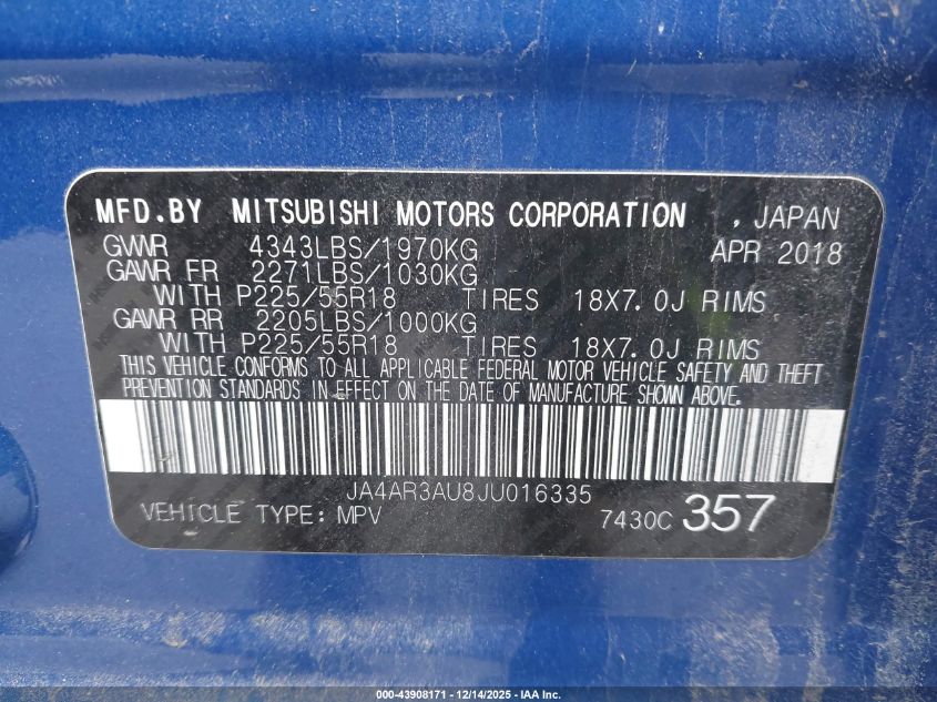 2018 MITSUBISHI OUTLANDER SPORT - JA4AR3AU8JU016335, колір - Синій, 2.0, Бензин, Повний привід із США