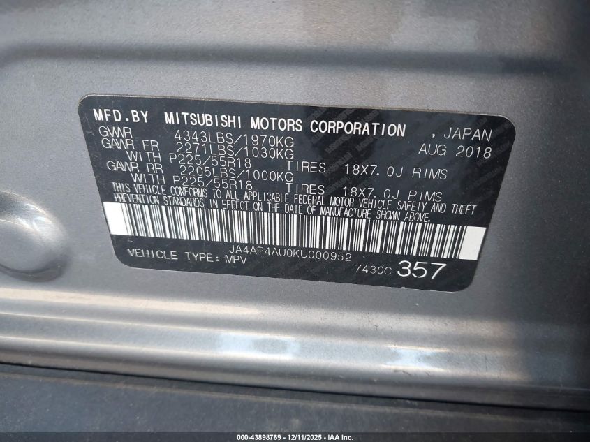 Колір СірийЦиліндри 4Привід Передній привідVIN JA4AP4AU0KU000952Стан СтаціонарноУшкодження Передня ліва