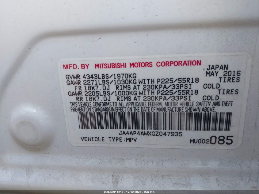 Колір БілийЦиліндри 4Привід Передній привідVIN JA4AP4AWXGZ047935Стан СтаціонарноУшкодження Передня або задня