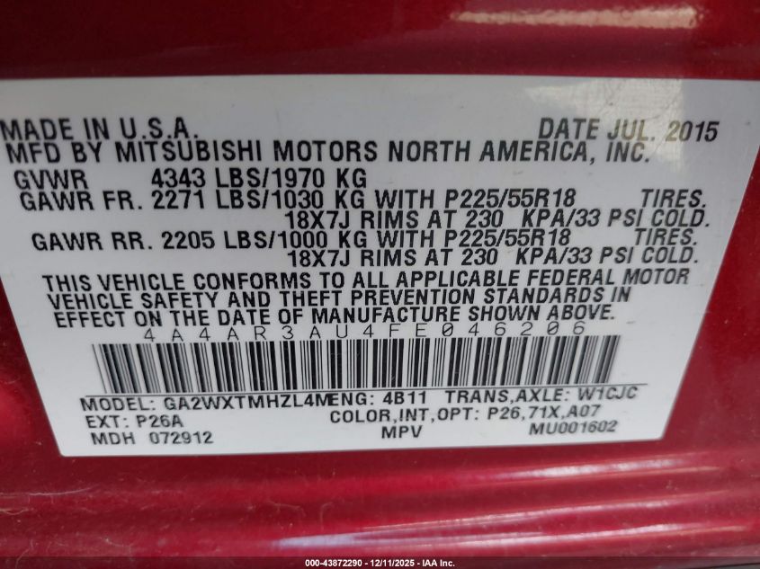 2015 MITSUBISHI OUTLANDER SPORT - 4A4AR3AU4FE046206, колір - Червоний, 2.0, Бензин, Повний привід із США
