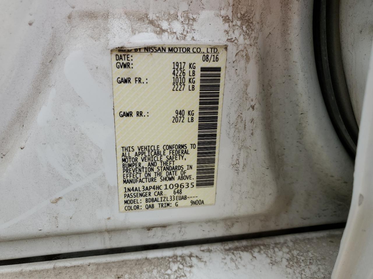 Колір БілийЦиліндри 4VIN 1N4AL3AP4HC109635Стан Заводиться та їде (перевірено)Ушкодження Задня