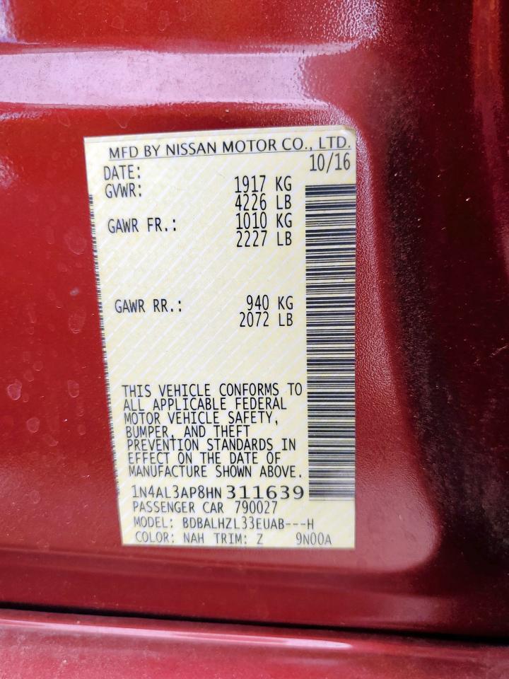 2017 NISSAN ALTIMA - 1N4AL3AP8HN311639, колір - Бордовий, 2.5, Бензин, із США