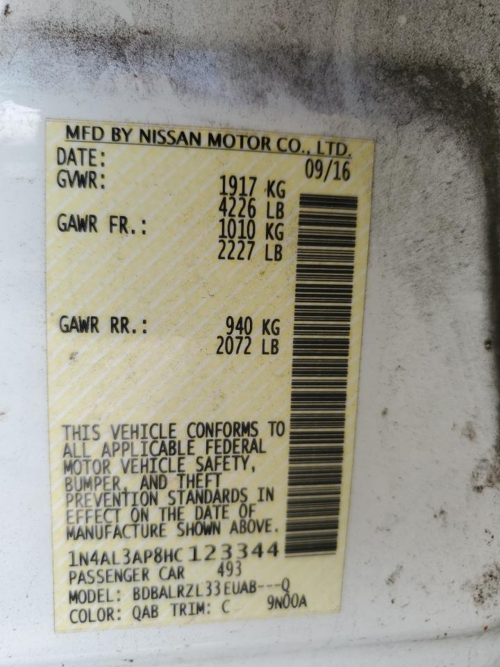 2017 NISSAN ALTIMA - 1N4AL3AP8HC123344, колір - Білий, 2.5, Бензин, із США