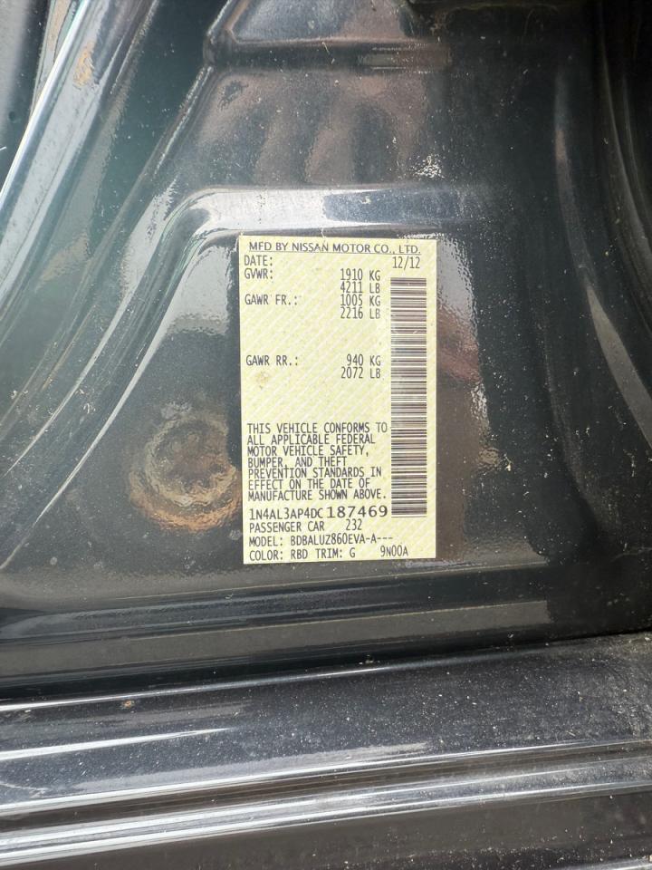 Колір ЧорнийЦиліндри 4VIN 1N4AL3AP4DC18746Стан Заводиться та їде (перевірено)Ушкодження НезначніДата аукціона 2025-10-06