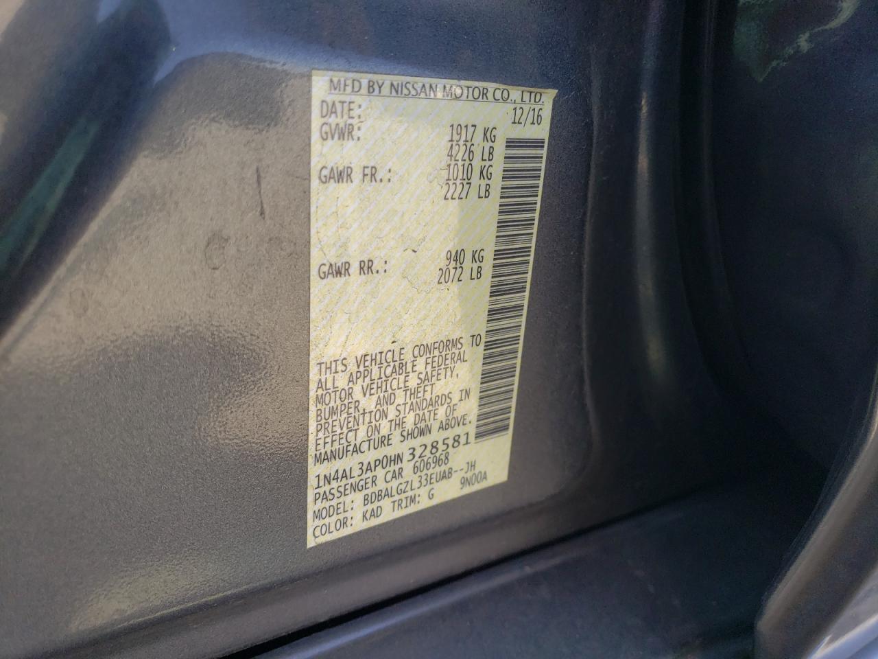Колір СірийЦиліндри 4VIN 1N4AL3AP0HN328581Стан ЗаводитьсяУшкодження Передня або задня
