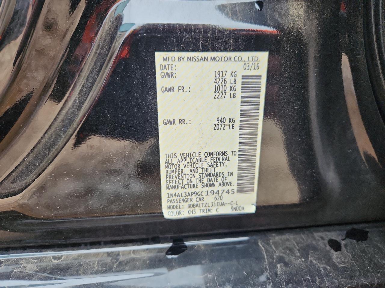 Колір ЧорнийЦиліндри 4VIN 1N4AL3AP9GC194745Стан Заводиться та їде (перевірено)Ушкодження Задня