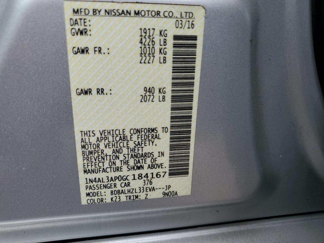 Колір СрібнийЦиліндри 4VIN 1N4AL3AP0GC184167Стан Заводиться та їде (перевірено)Ушкодження Передня або задня
