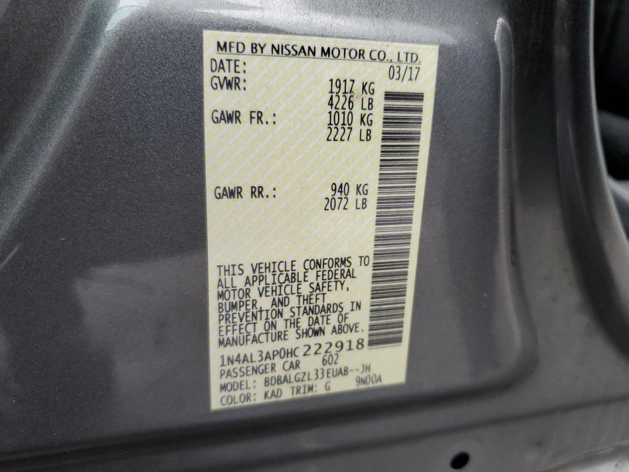 Колір СірийЦиліндри 4VIN 1N4AL3AP0HC222918Стан Заводиться та їде (перевірено)Ушкодження Передня або задня