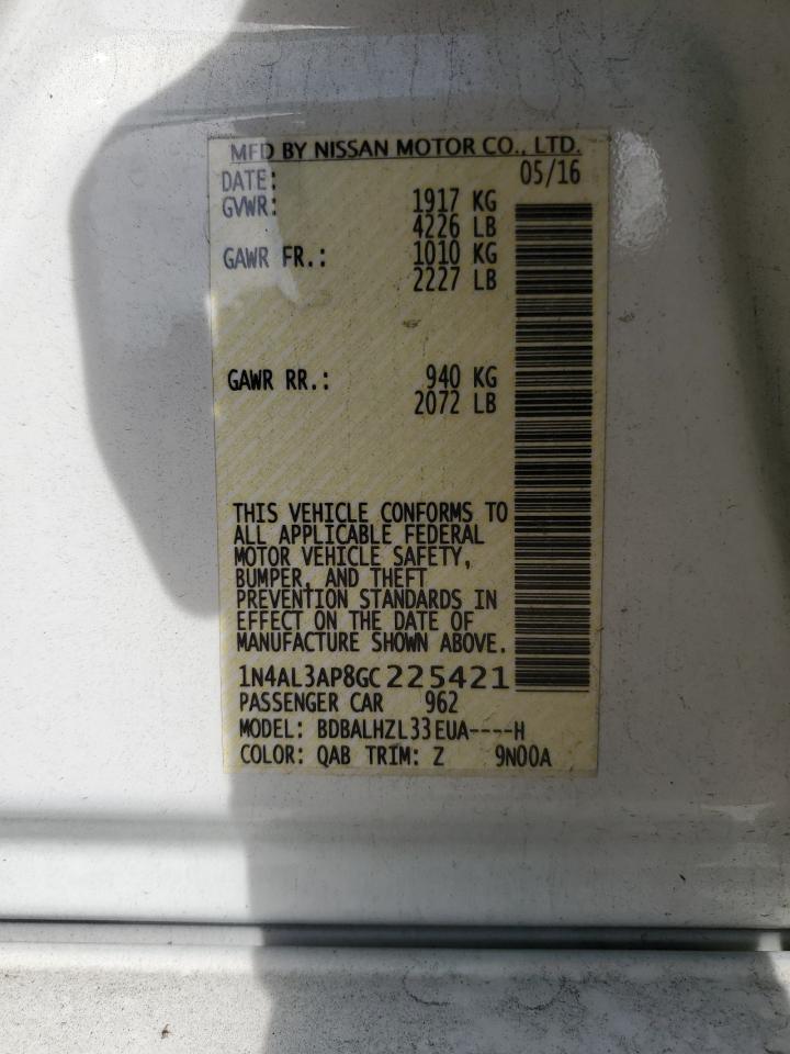 Колір БілийЦиліндри 4VIN 1N4AL3AP8GC225421Стан Заводиться та їде (перевірено)Ушкодження Передня або задня