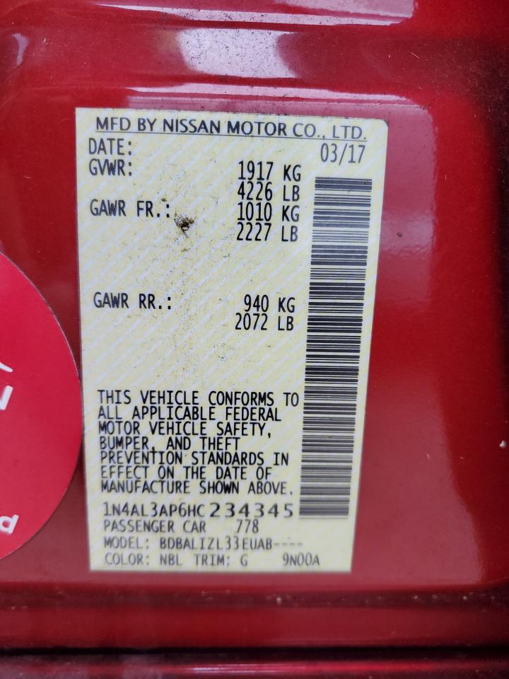 Колір ЧервонийЦиліндри 4VIN 1N4AL3AP6HC234345Стан НевідомоУшкодження Вода