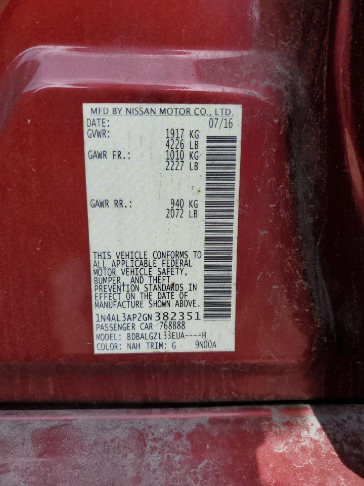 2016 NISSAN ALTIMA - 1N4AL3AP2GN382351, колір - Червоний, 2.5, Бензин, із США