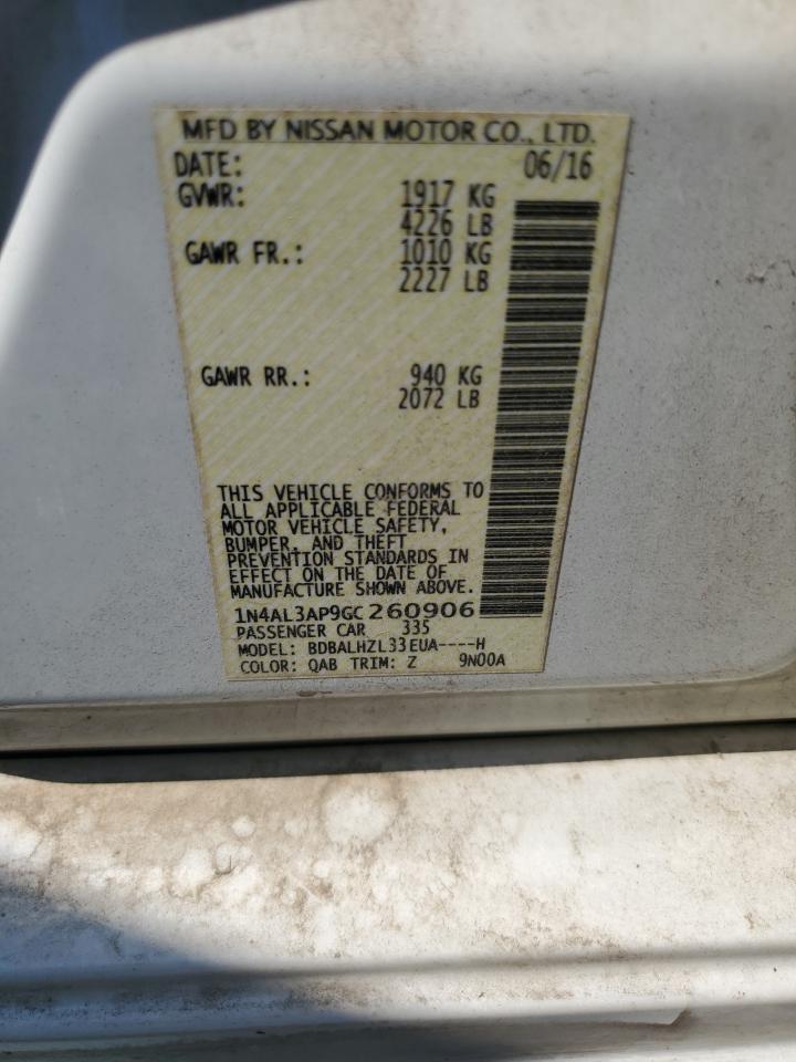 Колір БілийЦиліндри 4VIN 1N4AL3AP9GC260906Стан НевідомоУшкодження Передня або задня