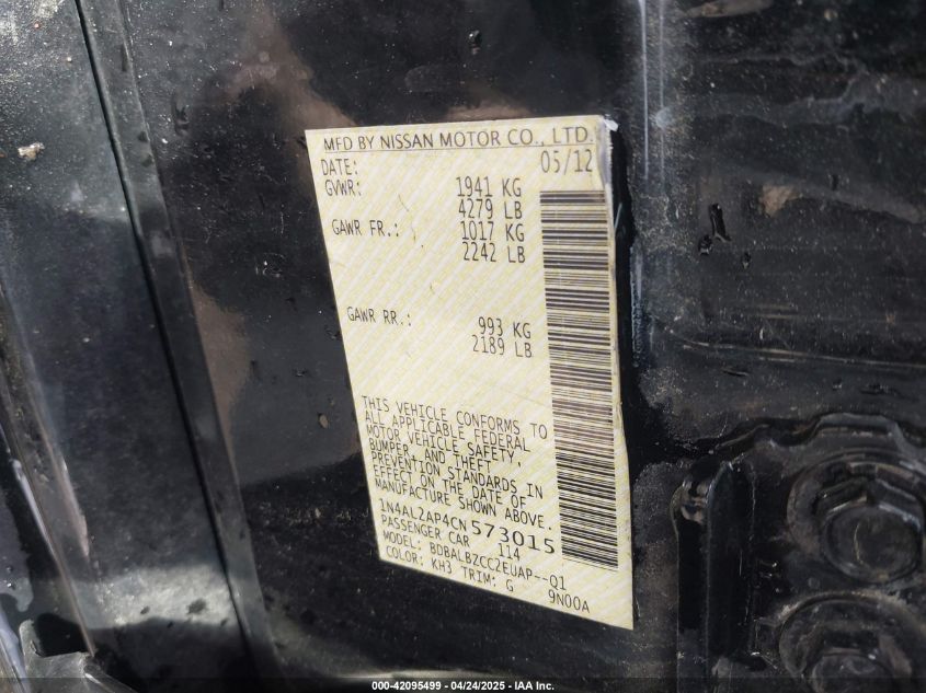 2012 NISSAN ALTIMA - 1N4AL2AP4CN573015, колір - Чорний, 2.5, Бензин, Передній привід із США