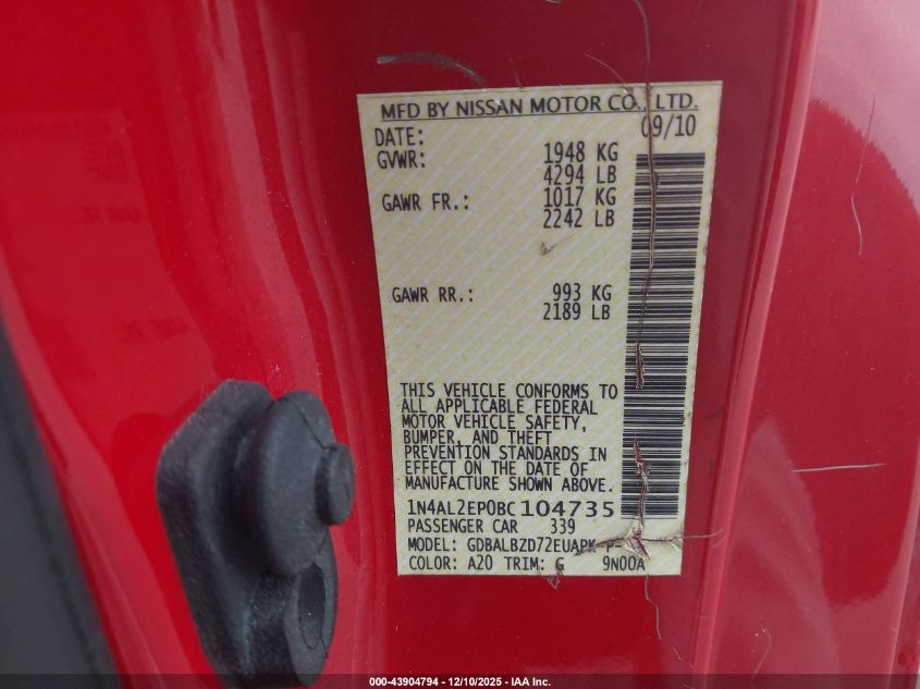 2011 NISSAN ALTIMA - 1N4AL2EP0BC104735, колір - Червоний, 2.5, Бензин, Передній привід із США