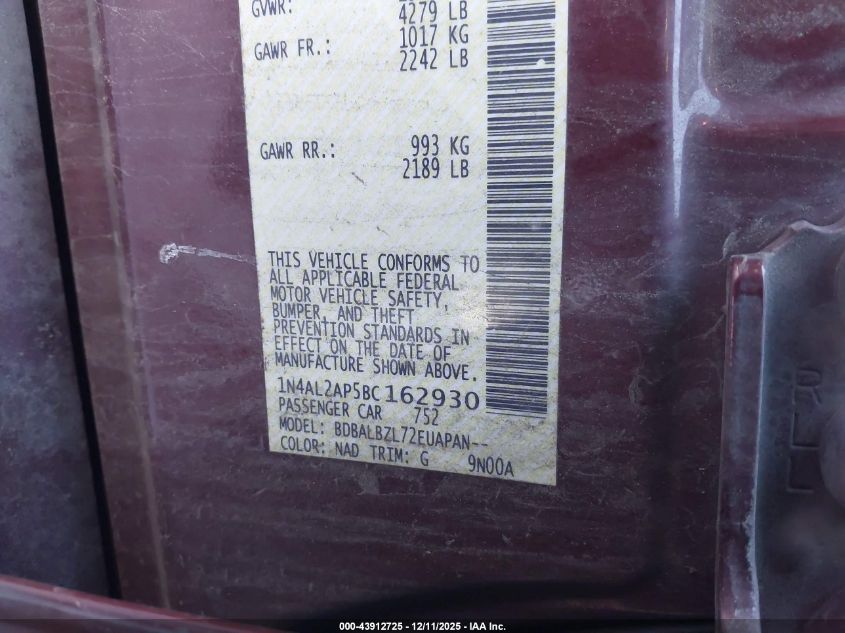 2011 NISSAN ALTIMA - 1N4AL2AP5BC162930, колір - Бордовий, 2.5, Бензин, Передній привід із США