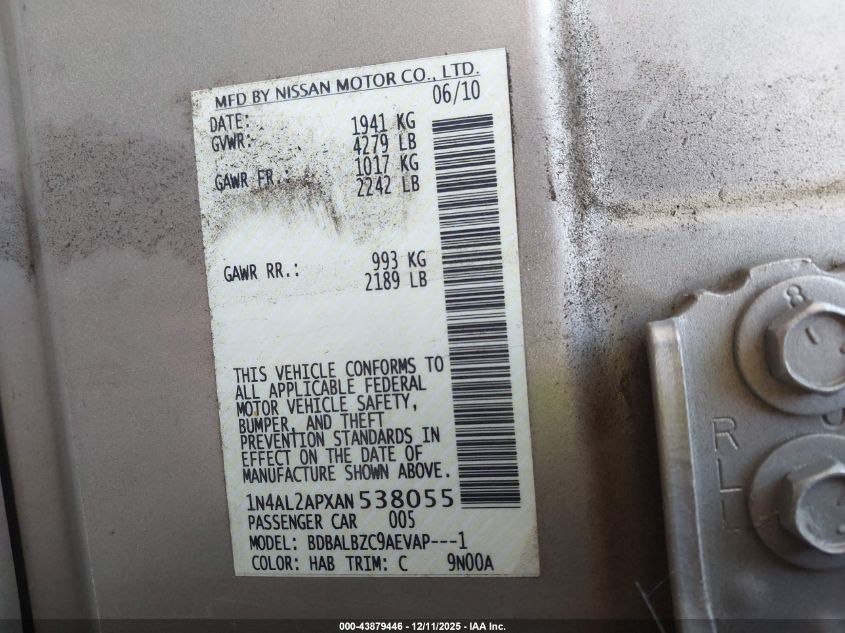 2010 NISSAN ALTIMA - 1N4AL2APXAN538055, колір - Бежевий, 2.5, Бензин, Передній привід із США