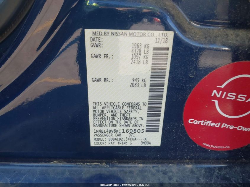 2019 NISSAN ALTIMA - 1N4BL4BV8KC169805, колір - Синій, 2.5, Бензин, Передній привід із США