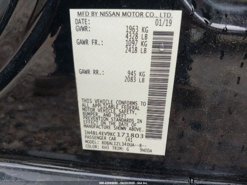 2019 NISSAN ALTIMA - 1N4BL4EV9KC171803, колір - Чорний, 2.5, Бензин, Передній привід із США