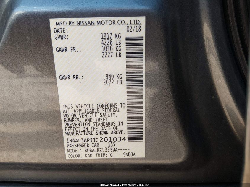 2018 NISSAN ALTIMA - 1N4AL3AP3JC201034, колір - Сірий, 2.5, Бензин, Передній привід із США