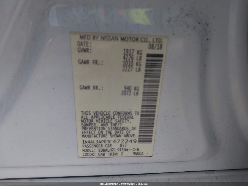 2018 NISSAN ALTIMA - 1N4AL3AP0JC477249, колір - Білий, 2.5, Бензин, Передній привід із США