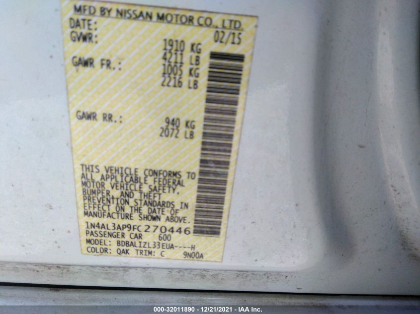 2015 NISSAN ALTIMA - 1N4AL3AP9FC270446, колір - Білий, 2.5, Бензин, Передній привід із США