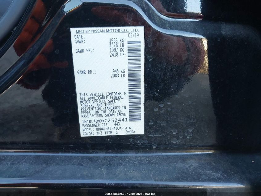 2019 NISSAN ALTIMA - 1N4BL4DVXKC252441, колір - Чорний, 2.5, Бензин, Передній привід із США