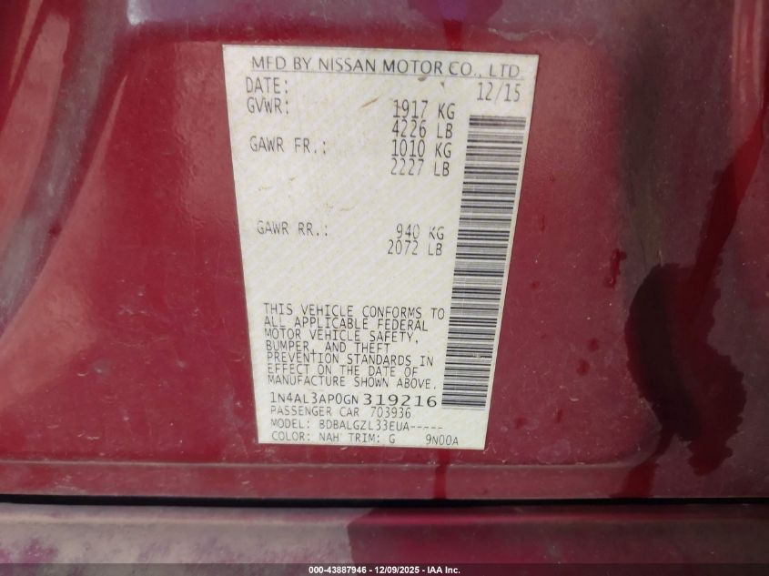 2016 NISSAN ALTIMA - 1N4AL3AP0GN319216, колір - Червоний, 2.5, Бензин, Передній привід із США